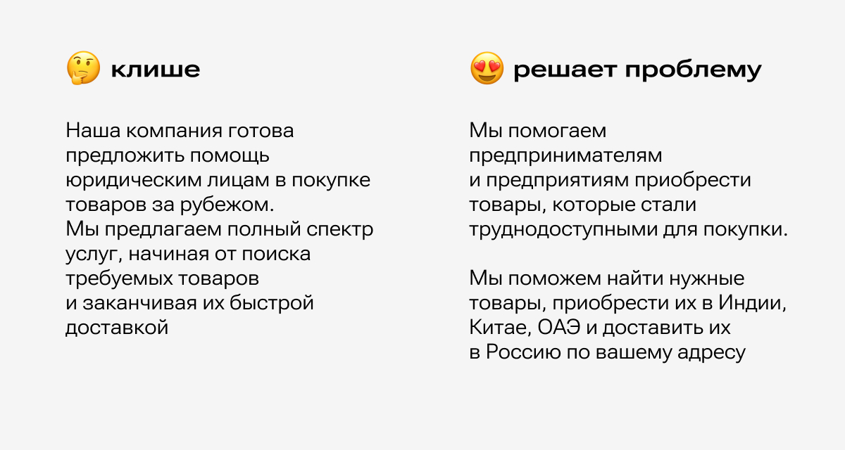 Не получится продать человеку то, в чем нет потребности. Здесь надо говорить прямо и простыми словами. Избегайте корпоративных клише, которые встречаются у большинства компаний на сайтах:
