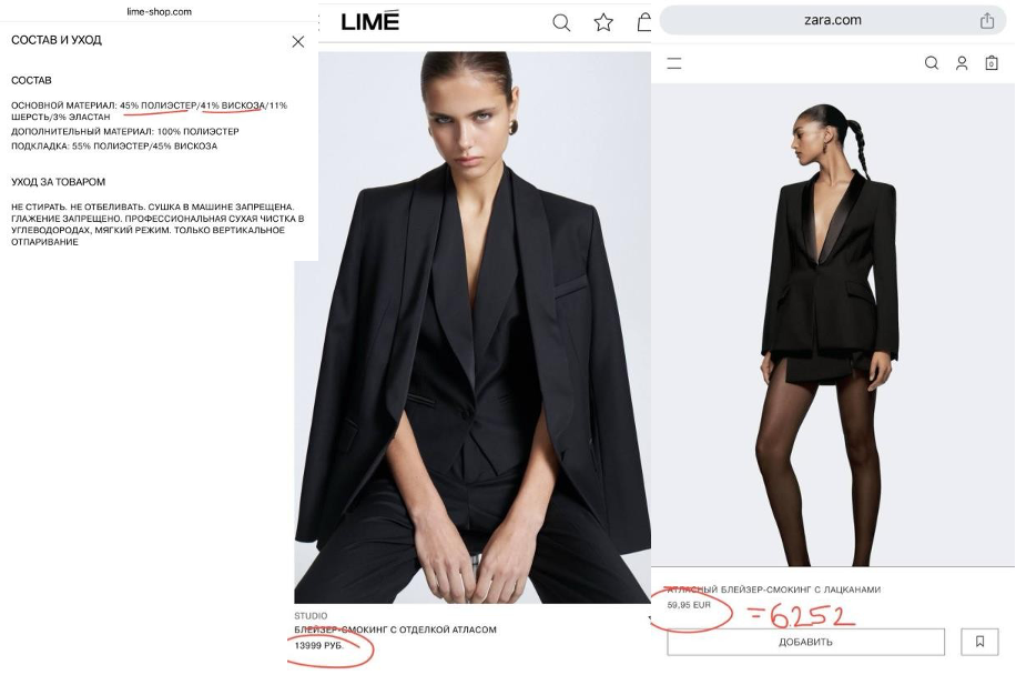 Удалось ли отечественному бренду заменить ушедшую Zara? Давайте посмотрим, что отличает бренды, а что в их развитии схоже. У LIME и Zara есть очевидные сходства. Одно из основных – следование концепции fast fashion, которая позволяет делать высокую моду более доступной. Сравнивая два бренда, хочется рассмотреть позиции из основной коллекции одежды. Например, блейзер-смокинг с атласом при схожем составе будет стоить в два раза дороже в LIME, чем в Zara. Получается, что западный аналог выйдет дешевле для покупательниц.