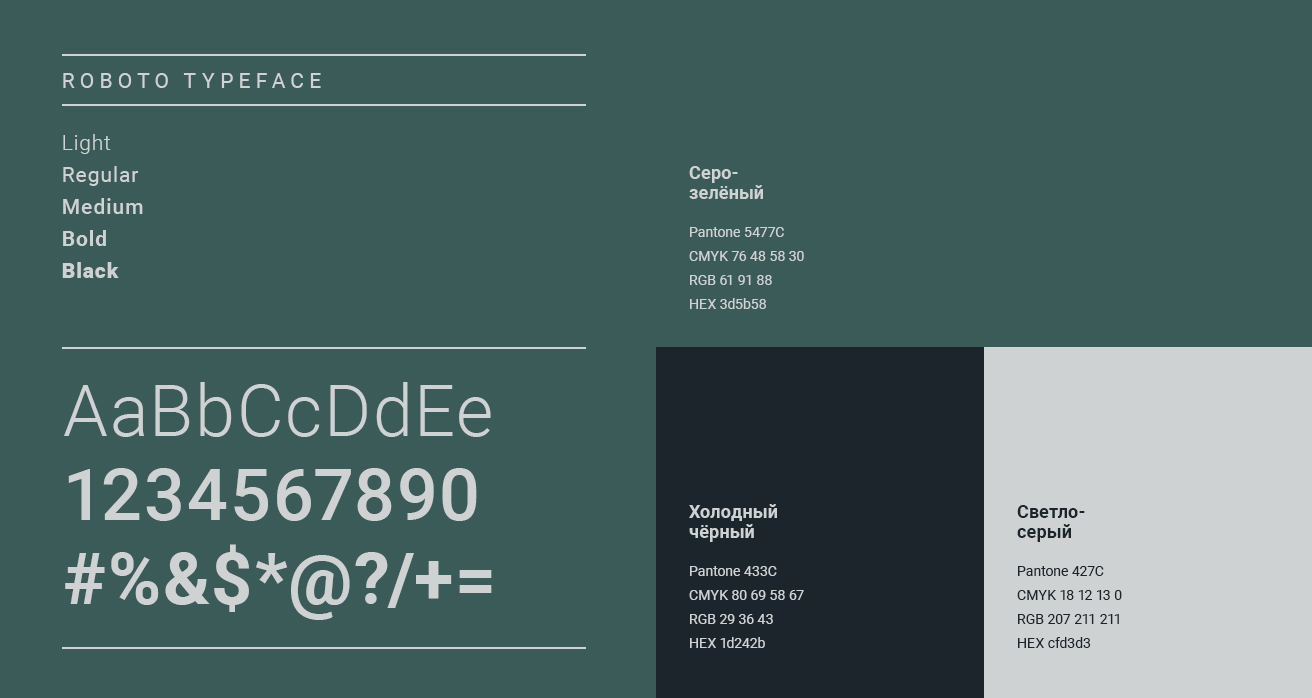 Основная палитра фирменных цветов из серо-зеленого, светло-серого и холодного черного подчеркивает качество, премиальность и отсылает к надежности материалов.