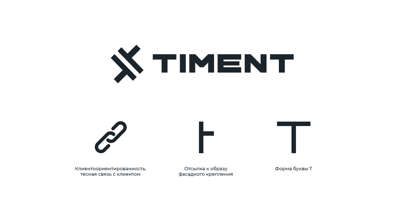 Логотип представляет собой сочетание уникального знака и шрифтового написания Timent. В идею знака вложено три основных направления: клиентоориентированность, стилизованная отсылка к фасадному креплению и монограмма, образованная от первой буквы названия.